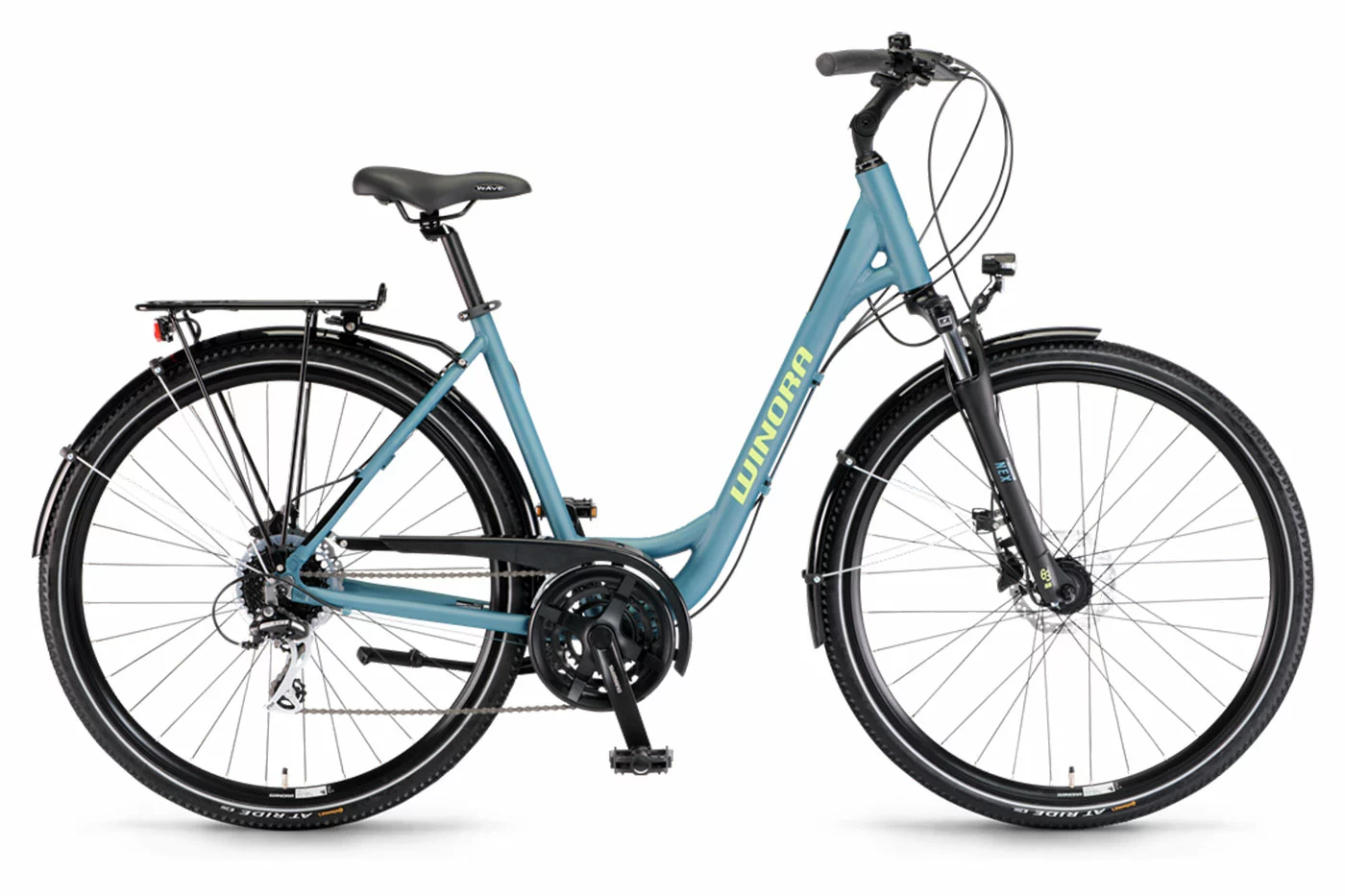 Das WINORA Domingo 24 ist vielseitig, dynamisch und für jede Tour bereit. Mit dem leichten, hochwertigen Aluminium-Rahmen und einer Federgabel von SR Suntour rollst du mit diesem Trekkingrad komfortabel über Asphalt sowie über Wald- und Schotterwege. Wenn es mal steiler bergauf geht, findest du mit dem leichtgängigen Shimano Acera Schaltwerk mit 24 Gängen immer die perfekte Übersetzung. Und auch bergab musst du dir dank starker Shimano Scheibenbremsen keine Gedanken machen. Bei längeren Ausfahrten schultert der serienmäßige Gepäckträger alles, was du unterwegs brauchst. Das Domingo 24 ist in den Rahmenvarianten High, Mid und Low erhältlich.